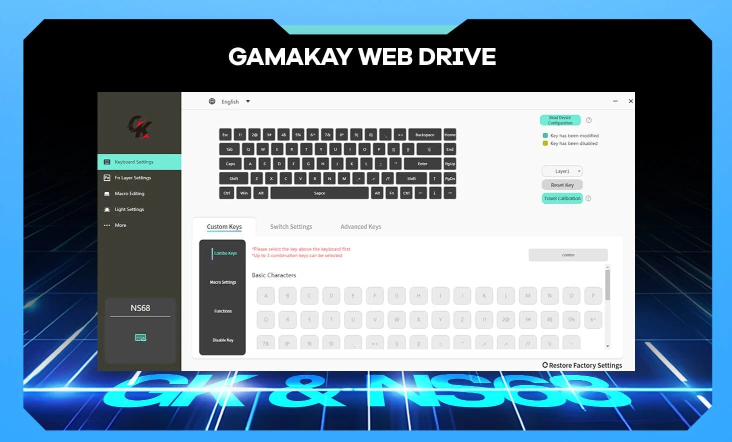 Tastatura Gamakay x Naughshark NS68 vine cu un driver web intuitiv, care îți permite să personalizezi totul direct din browser — fără instalări complicate. Ajustează cu ușurință efectele de iluminare RGB, setează Rapid Trigger-ul, macro-urile și alte funcții avansate, exact așa cum vrei tu.