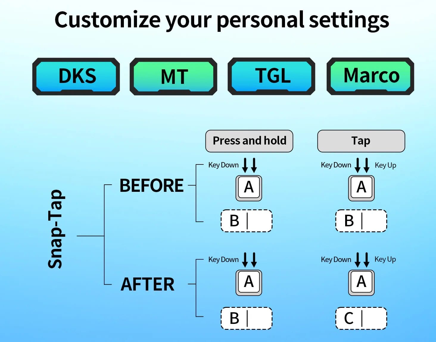 Rapid Trigger (Snap Tap) – reacționează instant la cea mai mică mișcare a tastei, permițând apăsări și ridicări ultra-rapide pentru control absolut în momentele critice.