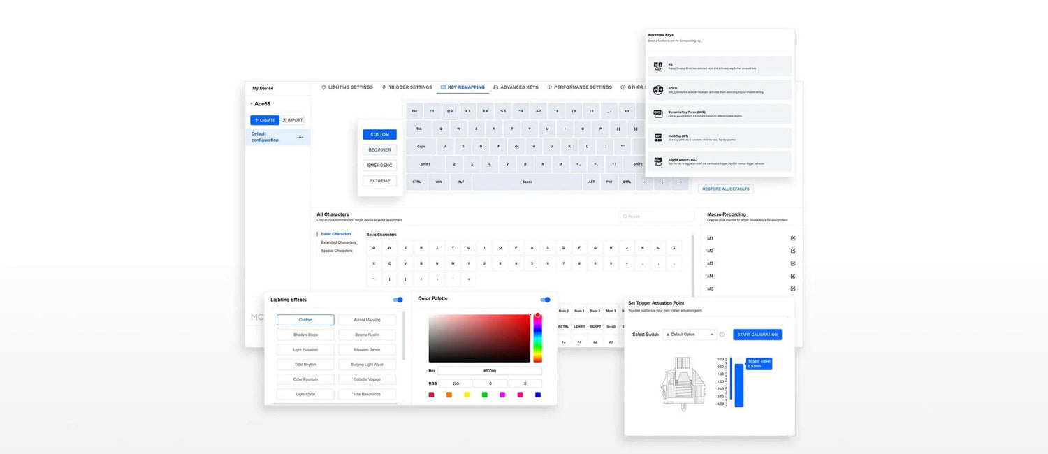 MCHOSE Ace 68 vine cu un driver web intuitiv, ușor de folosit, care îți oferă acces complet la toate setările tastaturii. Poți personaliza jocurile de lumini, ajusta rata de polling, modul SOCD, TGL, MT, Rapid Trigger-ul, punctul de actuare reglabil și multe altele — direct din browser, fără instalări complicate.